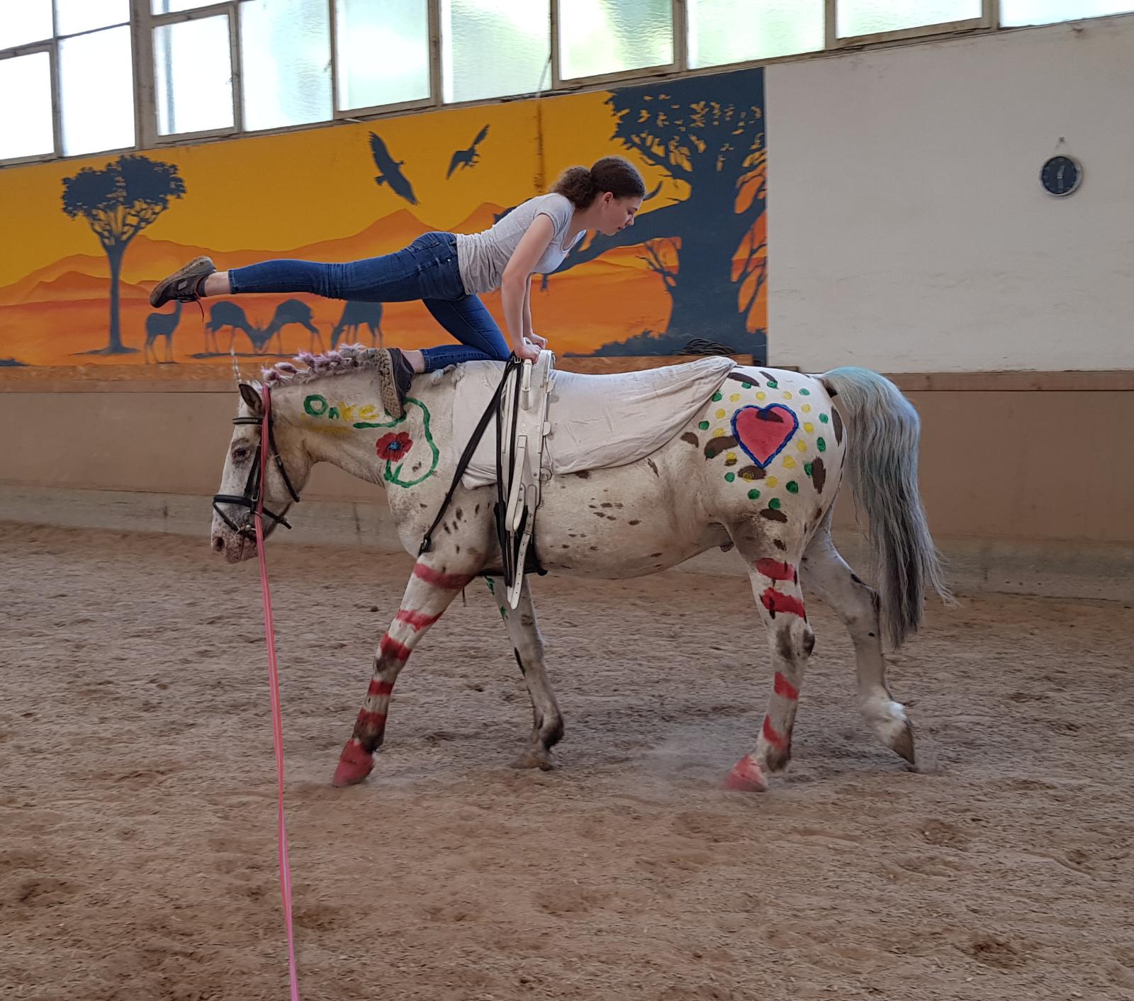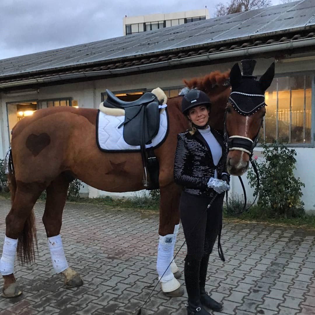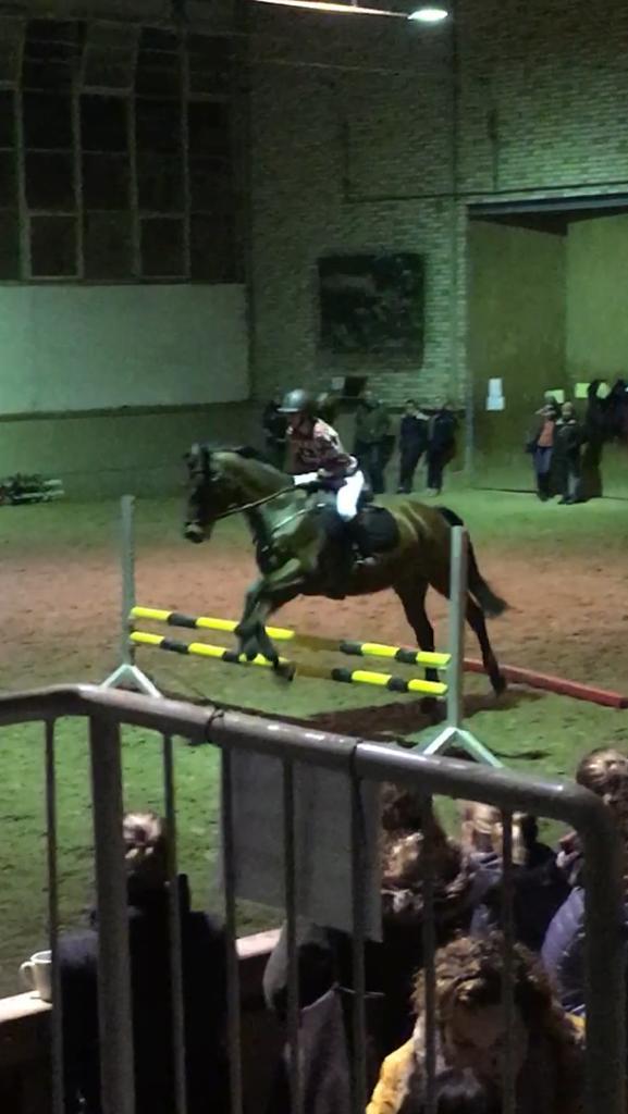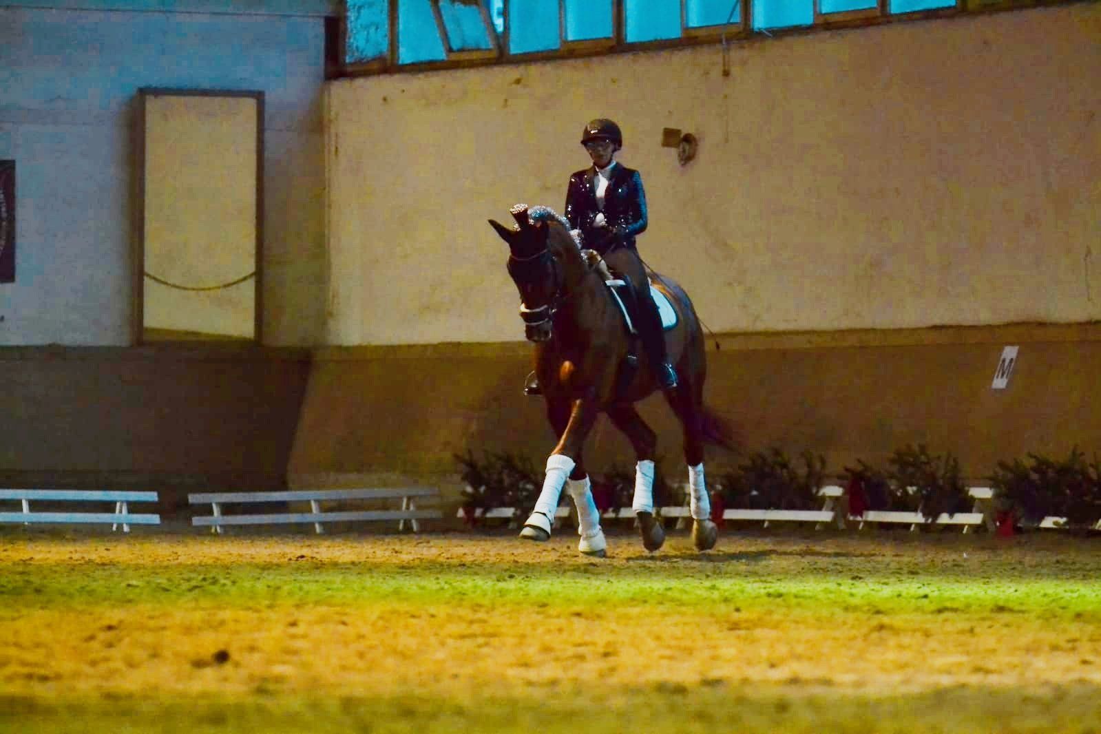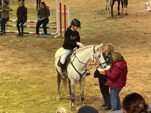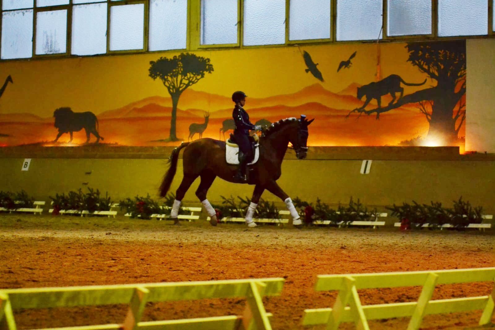 Das hat sich gelohnt! Am 09.12.2019 flog die Kuh… Nein, das Pferd… , und Zuckerfeen. Auf jeden Fall eine Mega-Weihnachtssause für Reiter und Pferdefreunde. Corinna Tomalik-Gützmacher schwebte mit ihrem Hengsti in Grand Prix-Manier zu einem Michael Jackson-Mix mit ordentlich Wumms durch unsere heilige Reithalle. Das Kostüm als stilisierter Sylvester war, wie der Auftritt des Profi-Dressurpaares, glamourös. Engelsgleich erschien auch das Schulpony Goliath mit Michaela Berger am Langzügel zu laufen. Ob das Schweben des langzügelführenden Engels bis zum nächsten Weihnachtsreiten antrainiert werden kann, bleibt offen. Folgend wurde die Reithalle durch eine Schar von Zuckerfeen okkupiert, die unsere Schulpferde in ihre Gewalt gebracht hatten und eine schwungvolle, präzise Weihnachtsquadrille zu moderner Klassik präsentierten. Eine wundervolle, kreative und anspruchsvolle Leistung von Sabrina Holdernig und ihren Reitschülerinnen. Nach den dressurmäßig durch das Viereck schwebenden Zuckerfeen, zeigten sich unsere Springreiter eher Düsenjet-mäßig fliegend mit ihren Pferden bei ihrem weihnachtlichen Programm-Punkt. Begleitet von weihnachtlichem Pop wurde ein Ritt durch eine Sprungabfolge, welche von E bis S schrittweise höher gelegt wurde. Die mutigen Weihnachtsrotröcke unseres Vereins sind Laura Volk mit La Strada, Sarah Ziegler mit Zigeunerin, Lotte Kehnel mit Cormac, Josi Weber mit Stinki und Domi Weber mit Löwenherz.